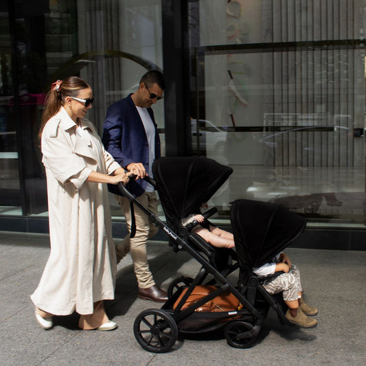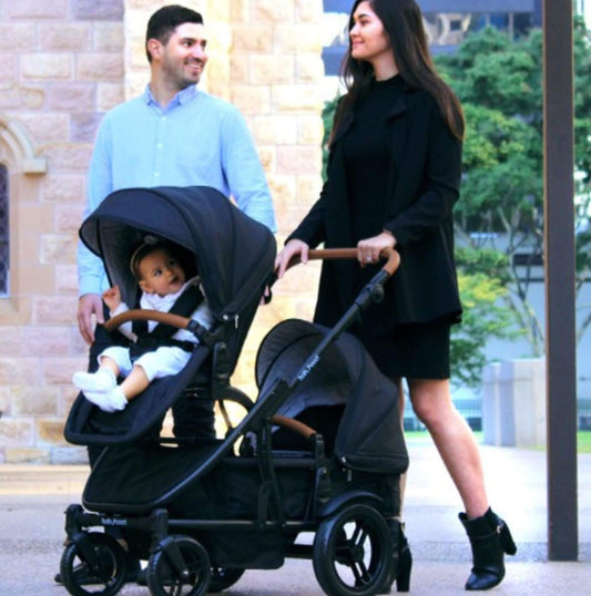 Inline double prams offer a streamlined design with one seat positioned behind the other.